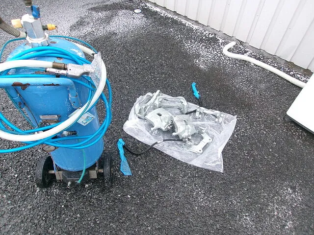 次にキャリパーの汚れを洗浄していきます。EZブラストと呼ばれるものを使って洗浄するのですが、これは重曹を使った粉末と水を同時に噴射することでキャリパーにこびり付いた汚れを素早く落とせる優れものです。欠点は写真を見てもらうと分かる通り、そこら中に白い粉が飛び散ることと、跳ねた粉末が手や顔に当たると痛いことです。ホース内部に粉末と水が入らないようにマスキングをしてから洗浄していきます。
