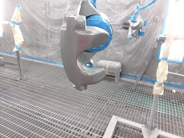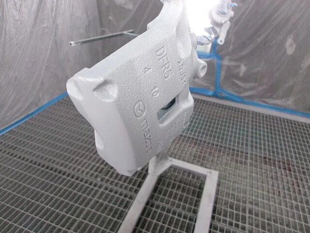再度脱脂を行い、EPプライマーを塗布していきます。これは鉄に非常に良く密着するプライマーで、足付けをしなくても塗装がキャリパーにしっかりと密着します。逆に言えばEPプライマーの塗装が甘いと塗膜剥がれの原因に直結しますので、細かいところの塗り忘れに気を付けながら塗装していきます。