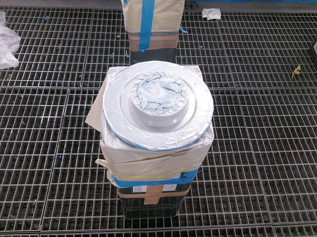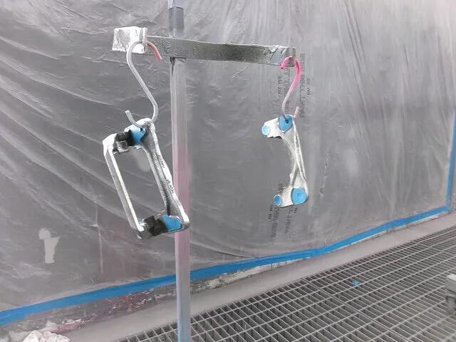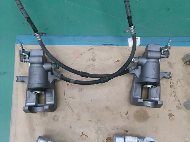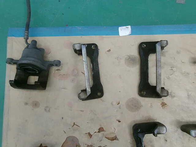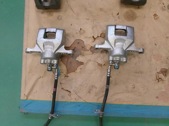取り外した後の写真になります。汚れがたまっていて、手作業で綺麗にするのは骨が折れるので、サンドブラストやEZブラストを使用して綺麗に洗浄していきます。また、キャリパー内部にブレーキオイルが残っている状態だと、後々不具合の原因になるので洗浄前のタイミングで抜いておきます。