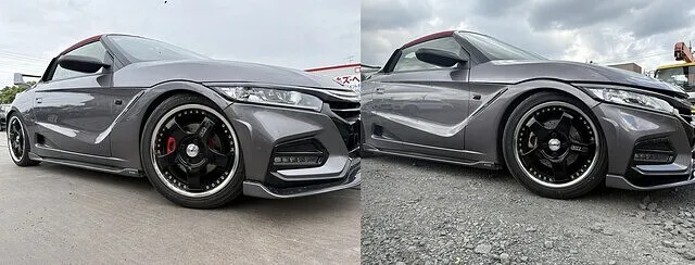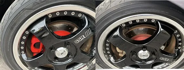施工前と施工後の写真を比べてみると、ガンメタのボディに赤色が映えるかっこいい仕上がりになったかと思います。純正で赤く塗装されていたローターも色と艶が戻り、新車に戻ったかのような仕上がりになりました。