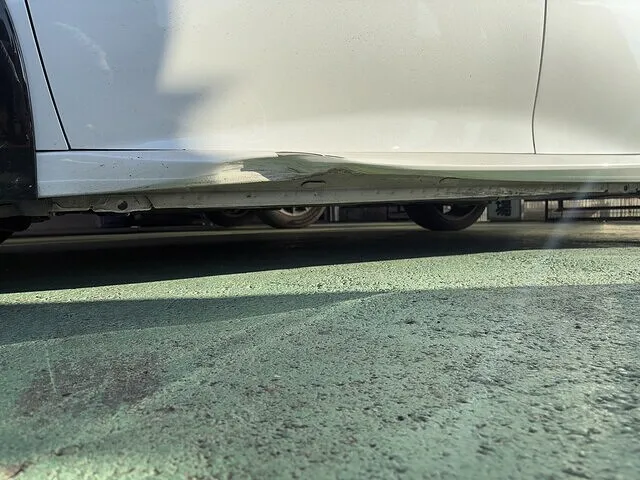プジョー 208 が入庫しました。左のロッカーパネルが大きく凹んでしまっています。このレベルの損傷ですとパネルの交換になるのが基本ですが、予算の都合上今回は鈑金での修理で対応させていただきます。