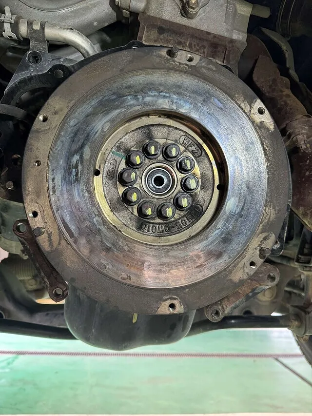 1-クラッチカバーASSYとフライホイールに合わせてマークをつける。その後ボルト6本を外してクラッチカバーASSY を取り外します。。